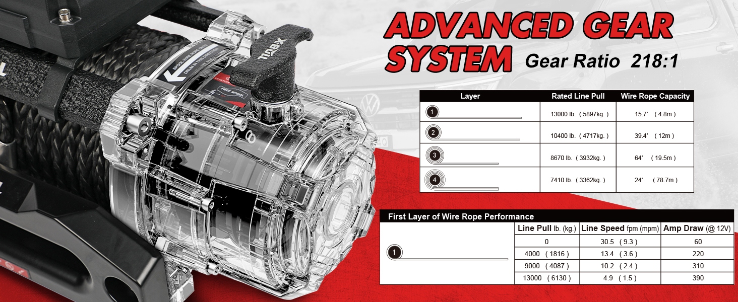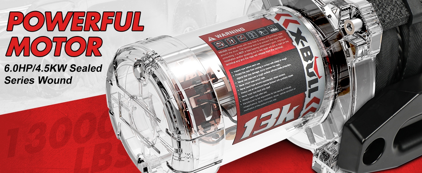 Nasza nowa wyciągarka została stworzona z myślą o mocy i wytrzymałości. Wyposażona w silnik z czystej miedzi o mocy 6,0 KM / 4,5 kW, z łatwością radzi sobie z obciążeniem do 13 000 lbs. Zaprojektowana do wymagających zadań, współpracuje z 3-stopniową przekładnią planetarną, oferując precyzyjne przełożenie 218:1. To połączenie zapewnia siłę potrzebną do wydajnego i stabilnego wyciągania nawet najcięższych pojazdów.